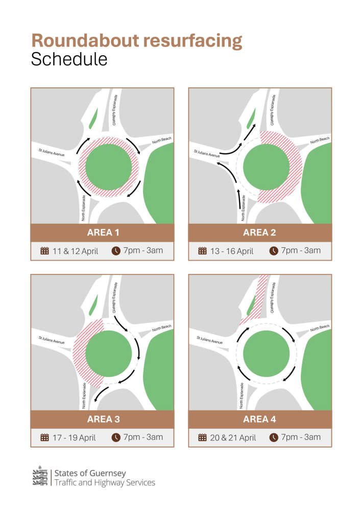Stage 3 - Overnight on Friday 17th, Saturday 18th and Sunday 19th April: The west side of the roundabout will be closed, which will mean that there will be no access to the roundabout from North Esplanade, no access to or from St Julian's Avenue, and no exit onto Glategny Esplanade.
