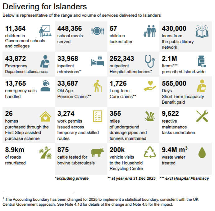 This included putting 11,354 children through school, serving 448,356 school meals, facilitating 252,343 outpatient appointments, prescribing 2.1 million items island-wide, paying for 555,000 days of Short-Term Incapacity benefits, and resurfacing 8.9 km of roads.