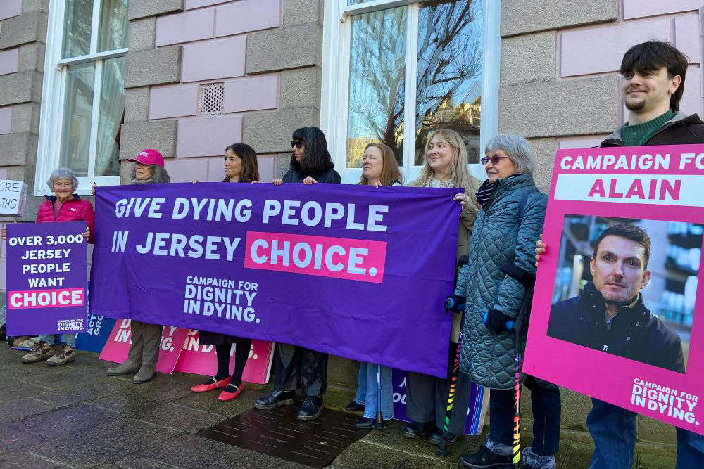 Dignity in Dying campaigners from Jersey and the UK are demonstrating outside the States building, and watching proceedings in person, as the Assembly takes an historic vote on assisted dying.