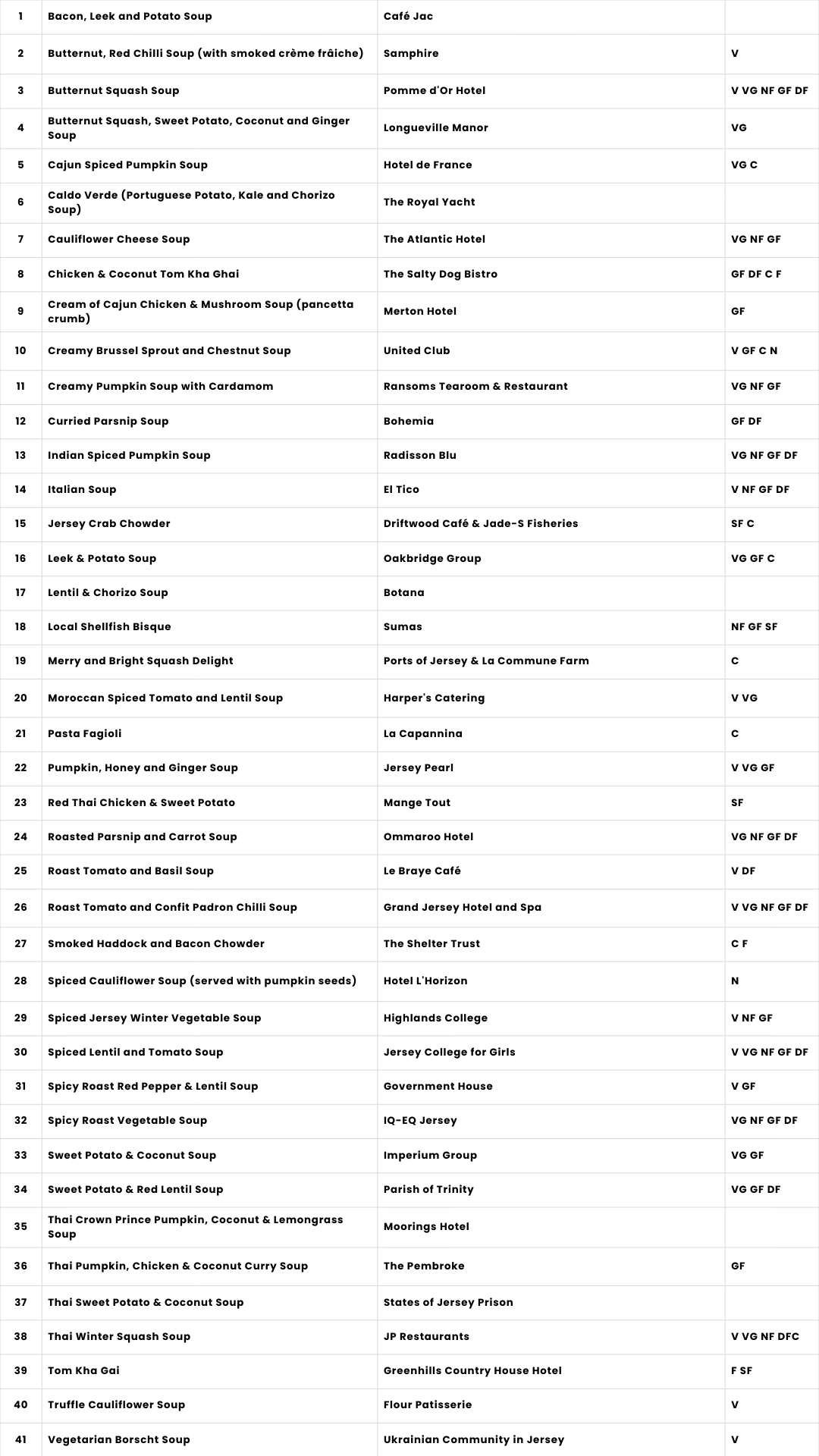 There are 41 flavours to choose from, ranging from cauliflower cheese soup to the classic leek and potato soup, creamy Brussels sprout and chestnut soup and Jersey crab chowder.
