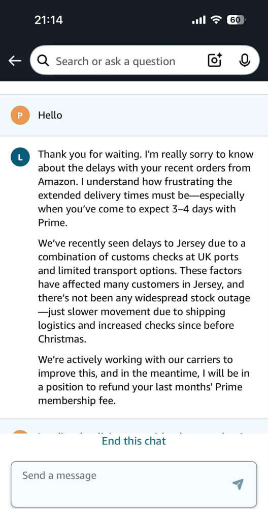 A screenshot of a chat with an Amazon Customer Service Agent, posted by one islander on social media last week.